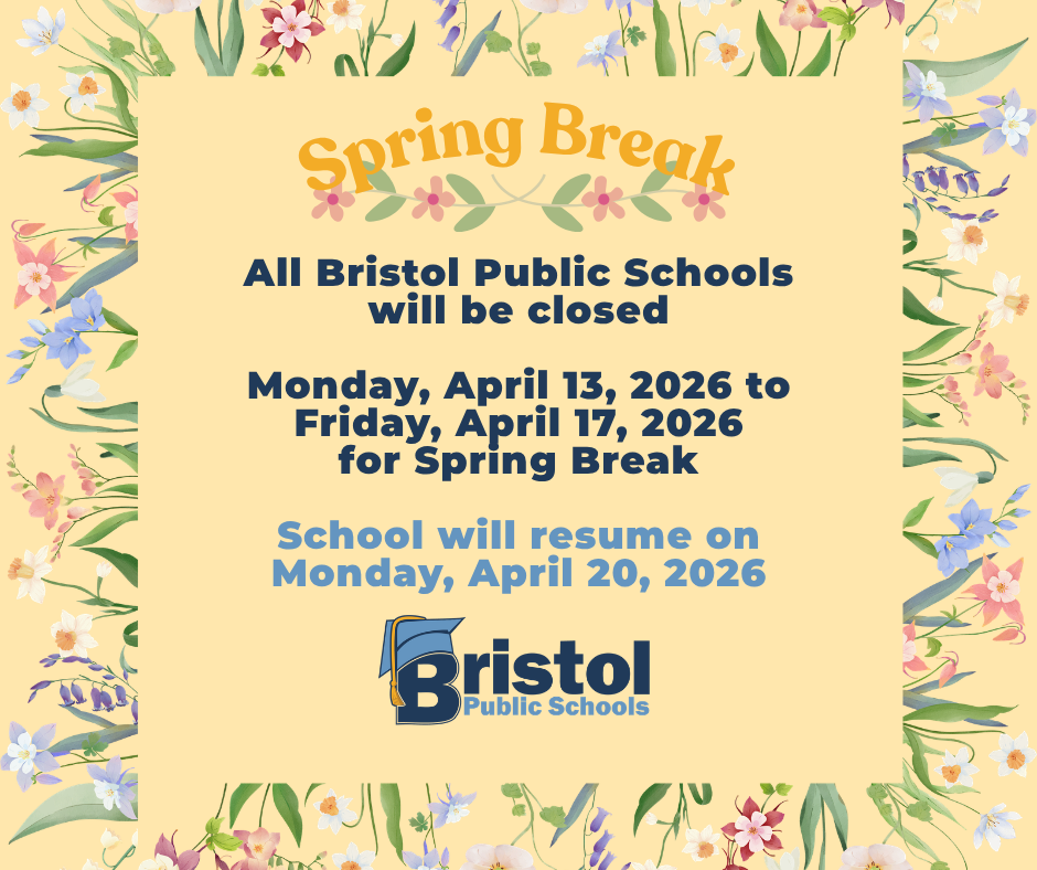 All Bristol Public Schools will be closed Monday, April 13, 2026 to Friday, April 17, 2026 for Spring BreakSchool will resume on Monday, April 20, 2026